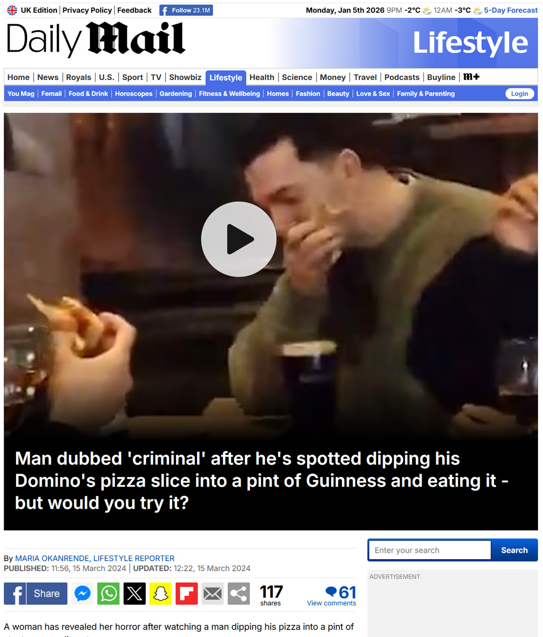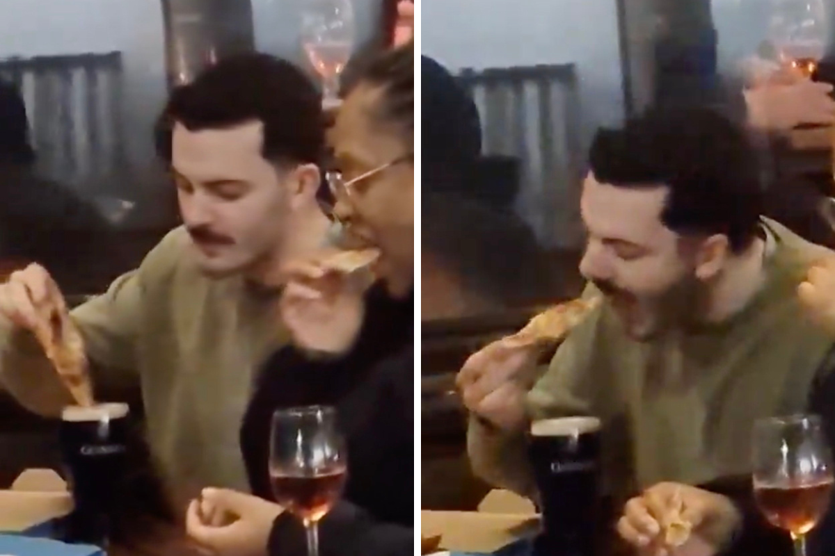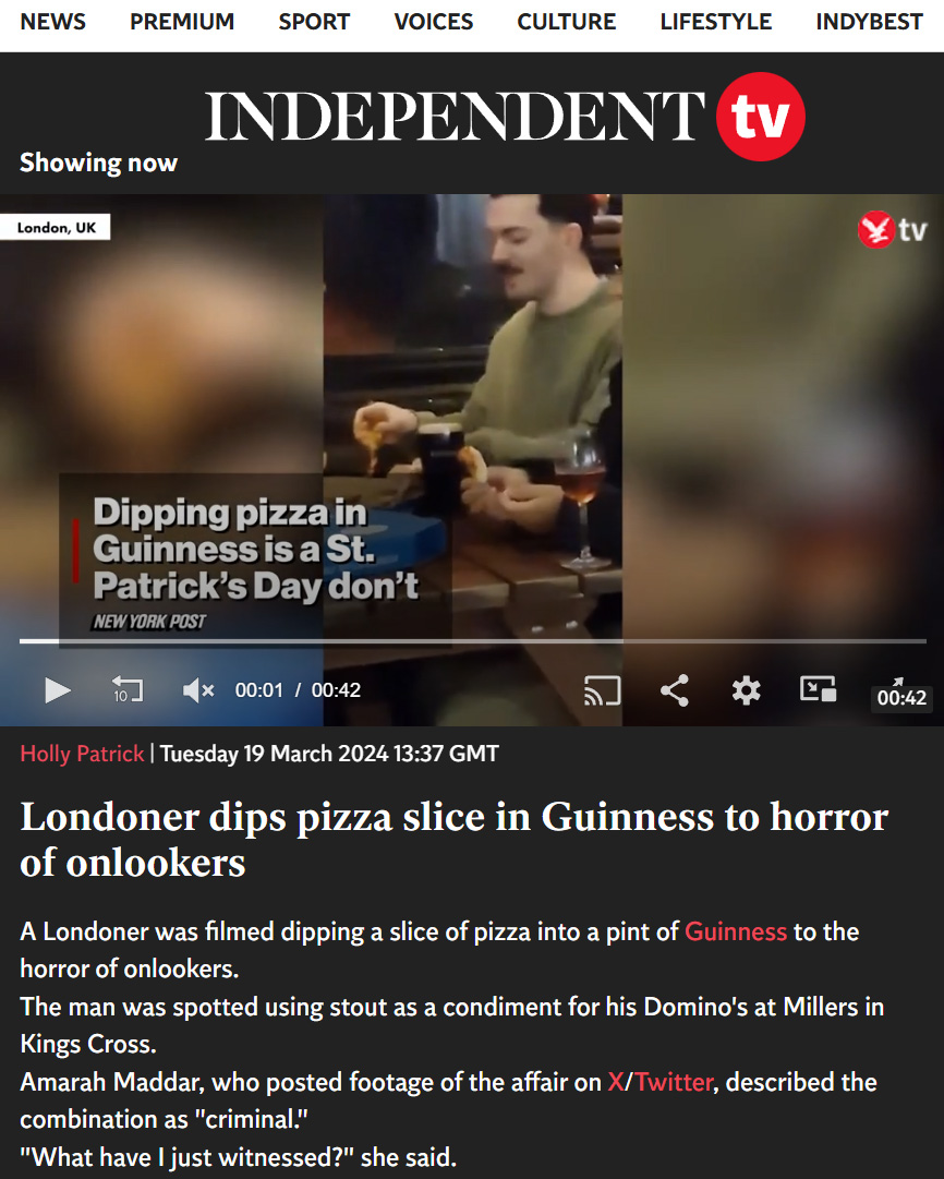 St. Patricks Day - A man was ‘spotted’ dipping a slice of his Domino’s pizza into his pint of Guinness outside a pub.