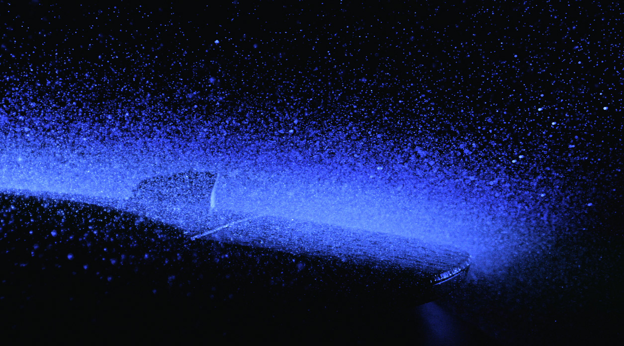 Thousands of drops of UV paint are released over the car. They impact and splash to reveal the dramatic roofline out of the darkness. Then the drops are blown to reveal the key design lines and finally reveal the F-PACE in a way we have never seen it before - design in a new light!