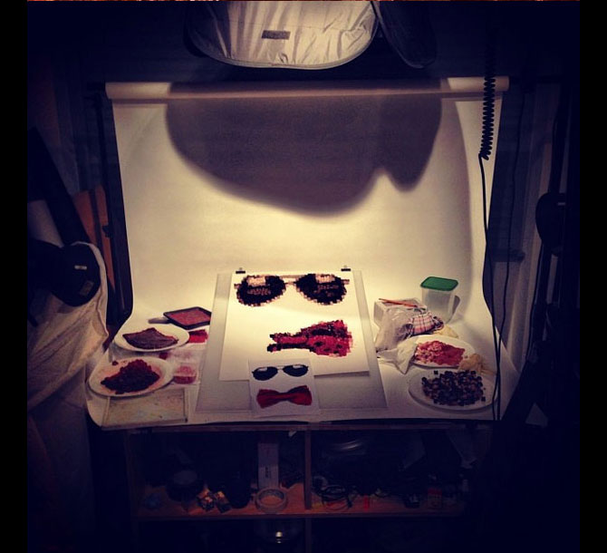 Creating a meat mosaic threw up a number of problems. I'd never worked with meat before as an artistic medium. Most of the preparation time went into meat research and establishing the palette. Getting a broad gamut of meat colours to provide contrast in the image was a challenge. A lot of meat colours tend to be in a very narrow band of pinks and reds. The hardest medium to work in is lamb's liver. It is slippery to handle, and big differences in texture and density make it difficult to cut with accuracy. It also smelt pretty bad after a few hours of handling under hot studio lights.