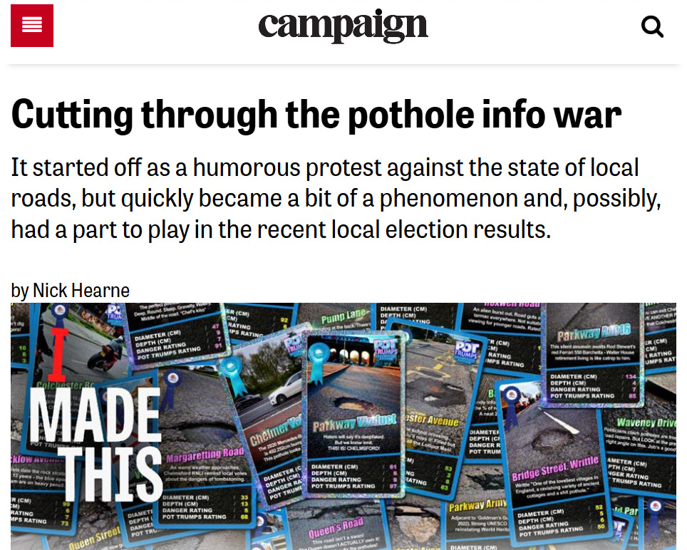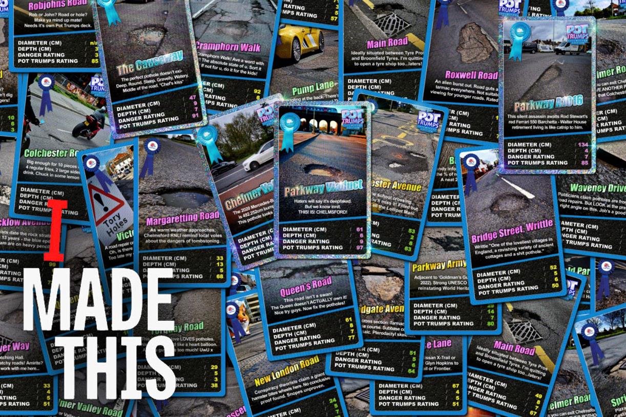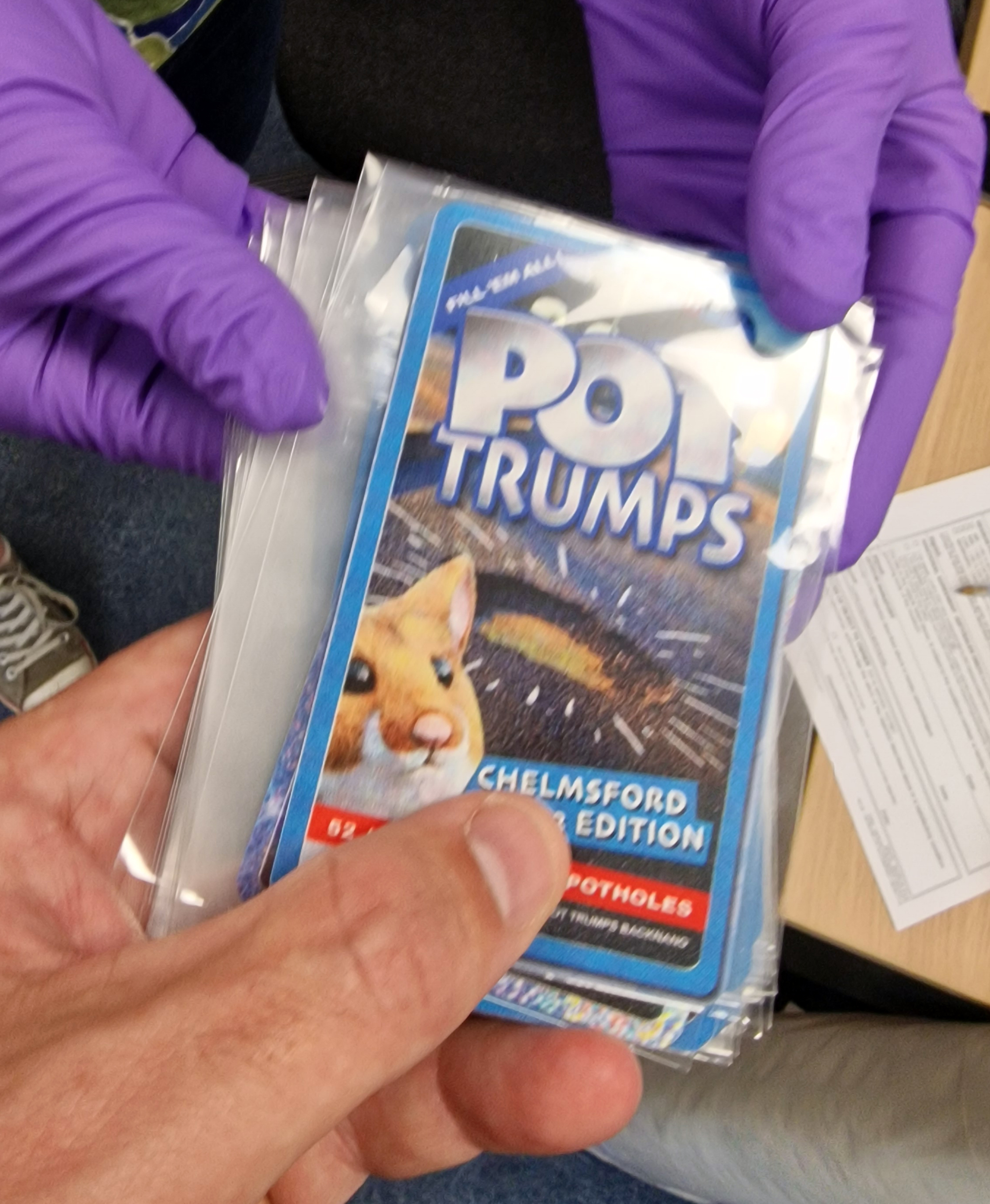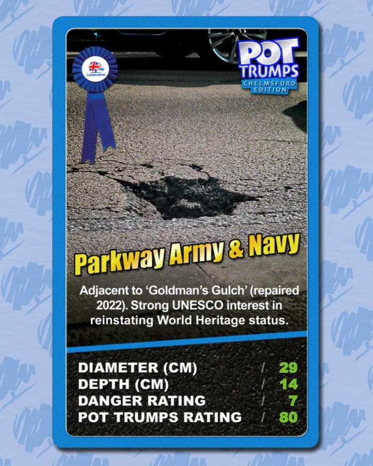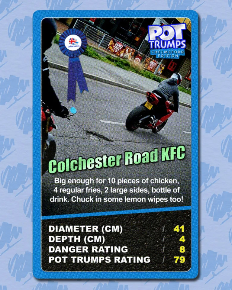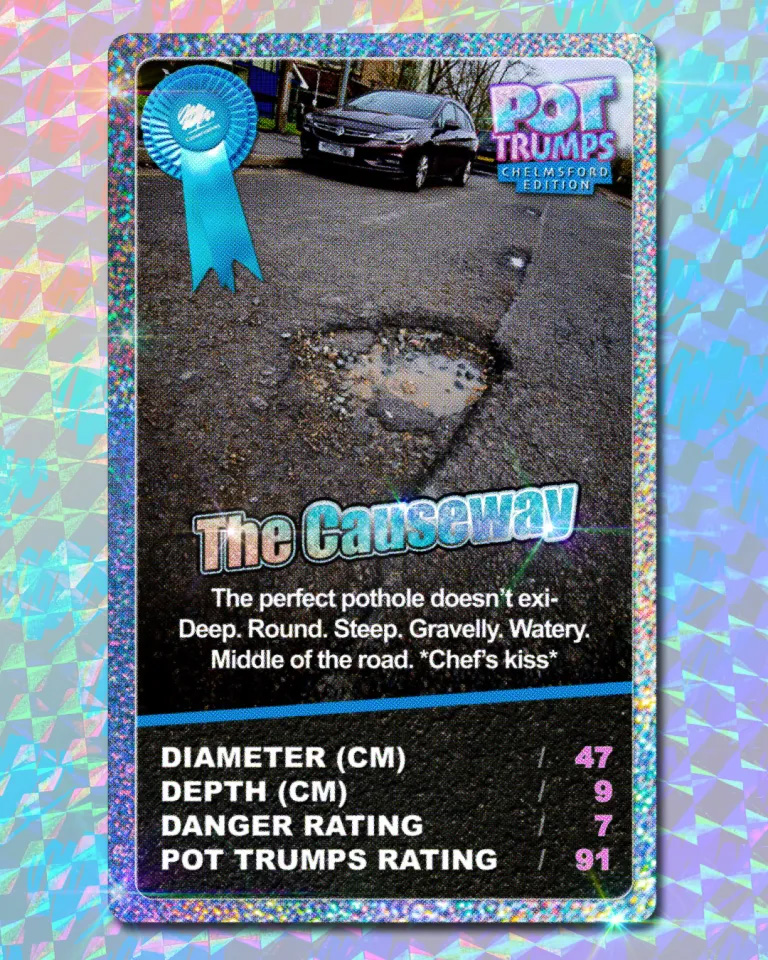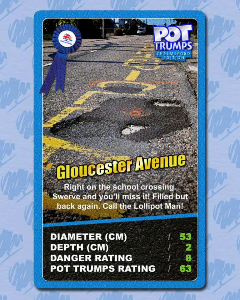 Pot Trumps made Chelmsford’s pot holes into a card game. With ratings for depth, danger, width and the mysterious ‘Pot Trumps rating’.