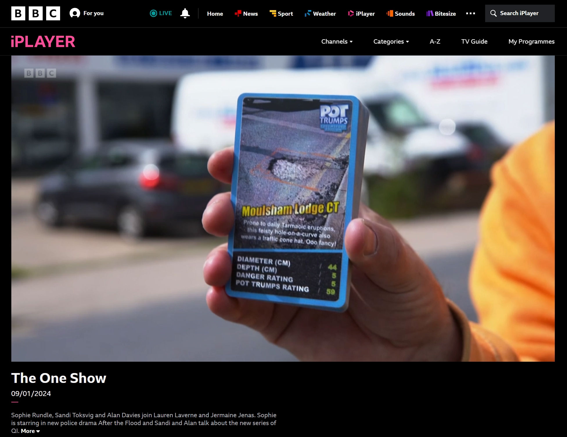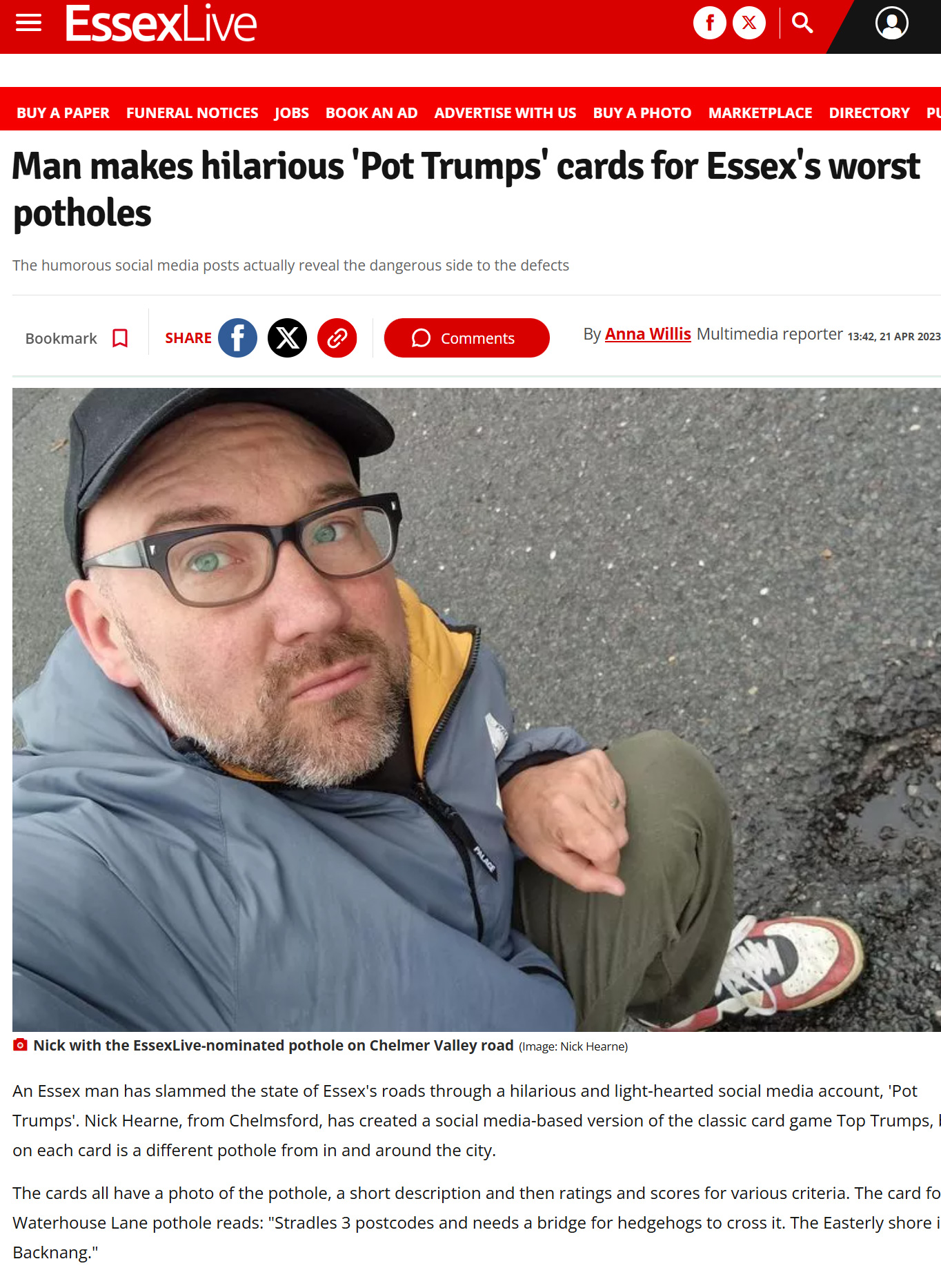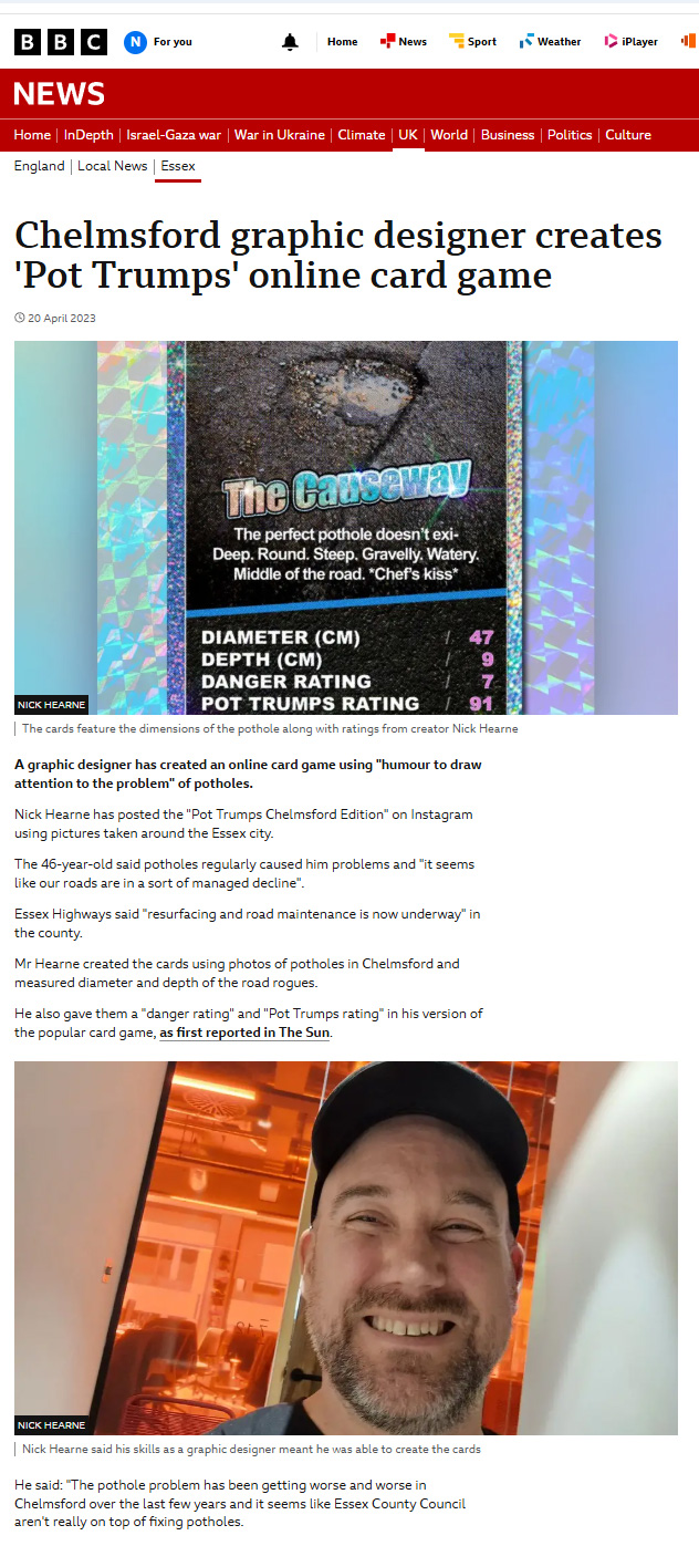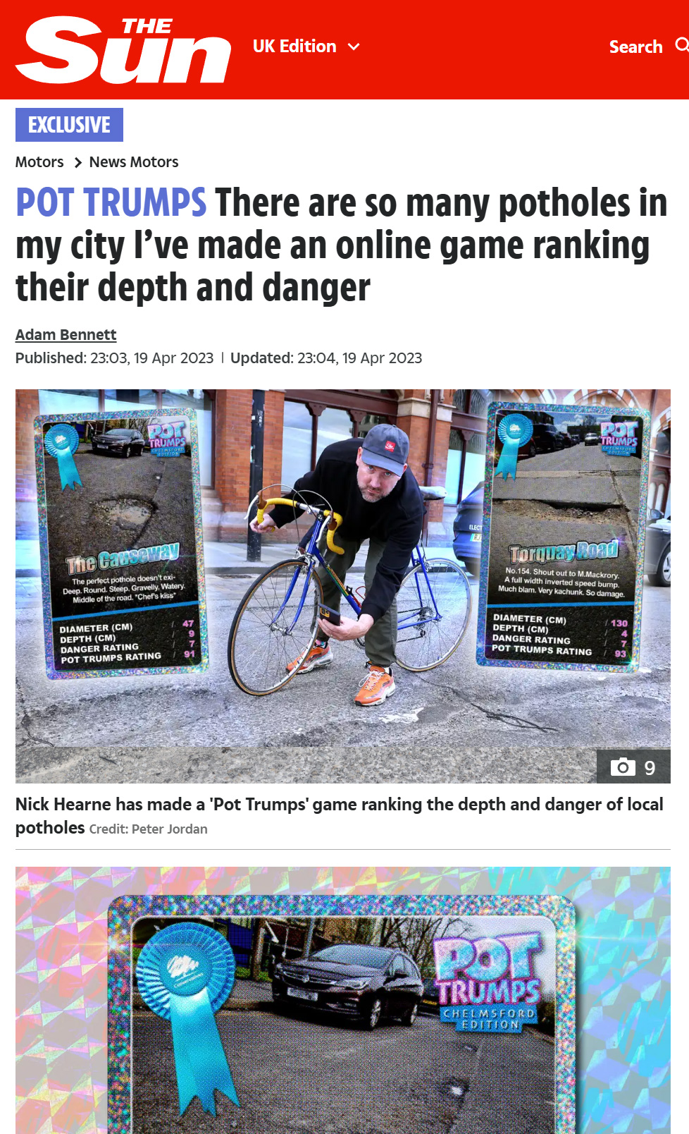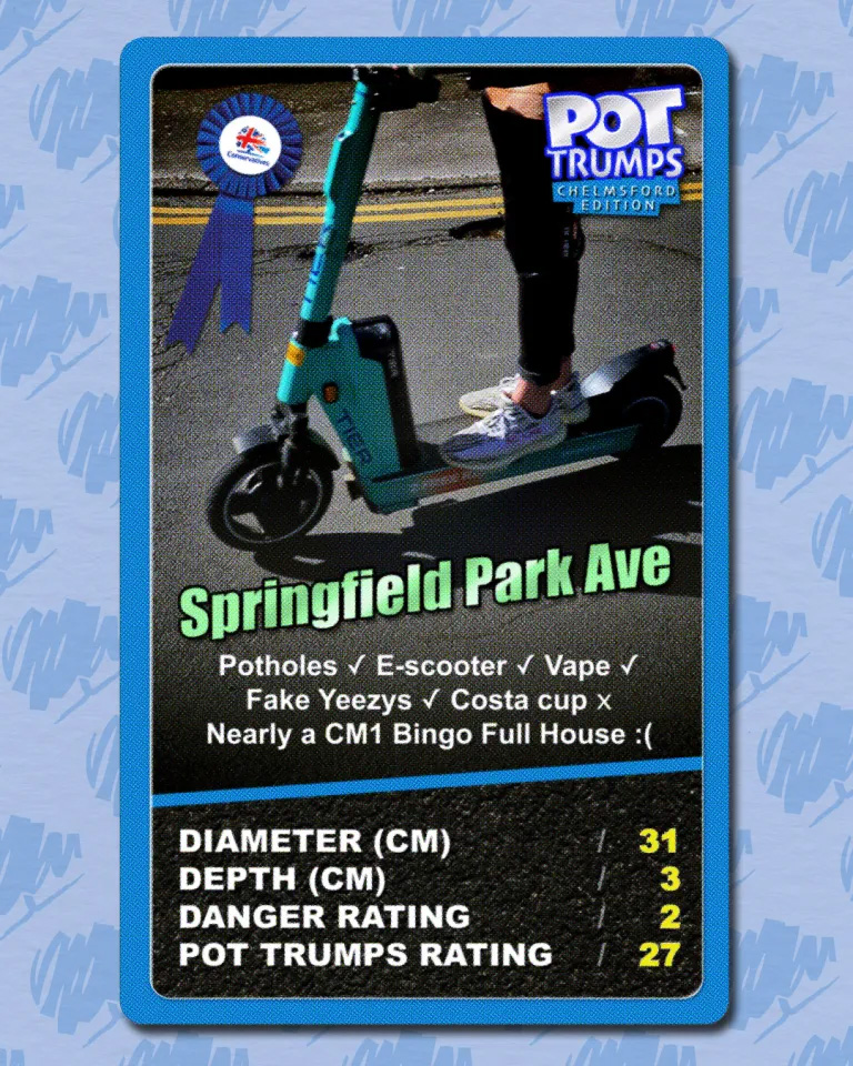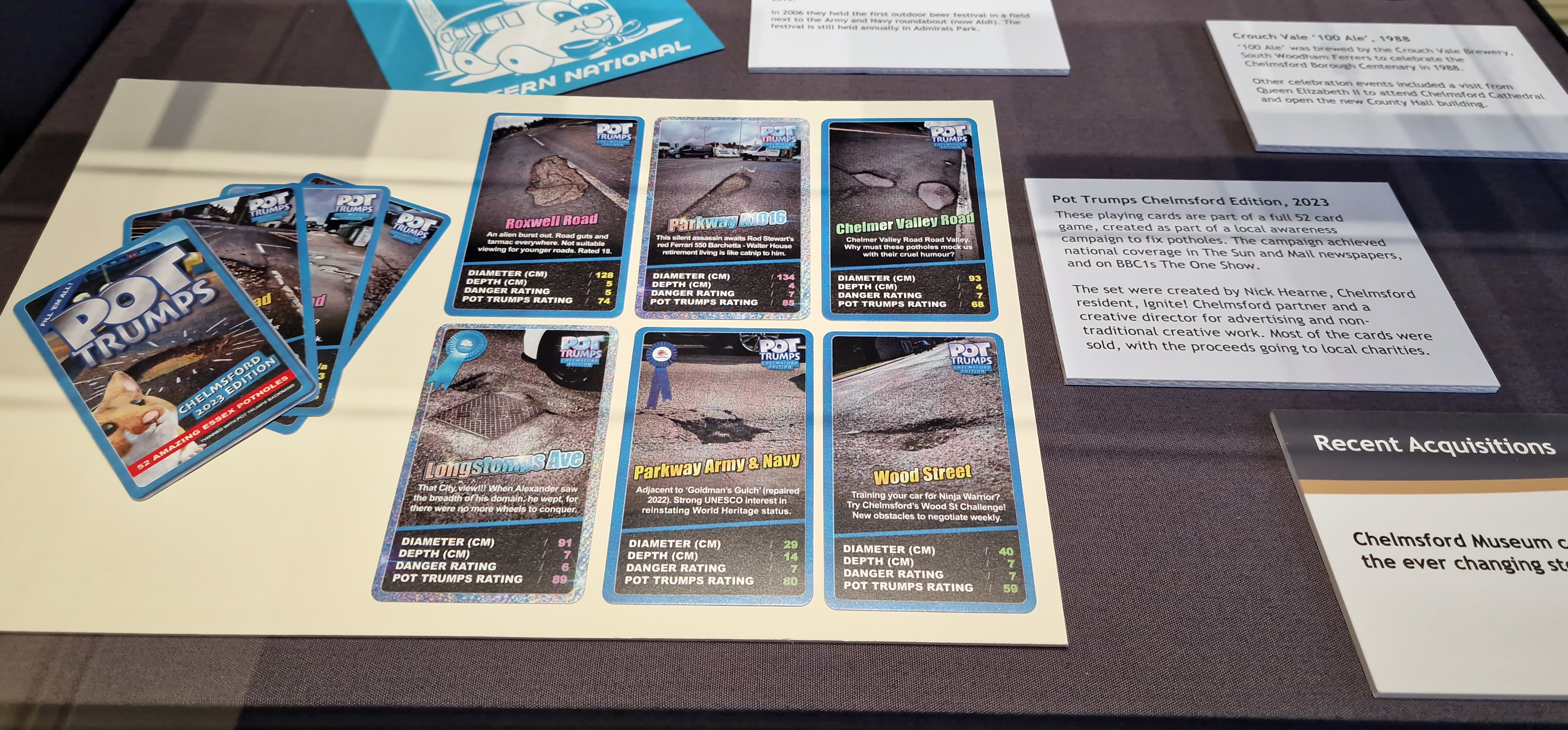 Pot Trumps made Chelmsford’s pot holes into a card game. With ratings for depth, danger, width and the mysterious ‘Pot Trumps rating’.