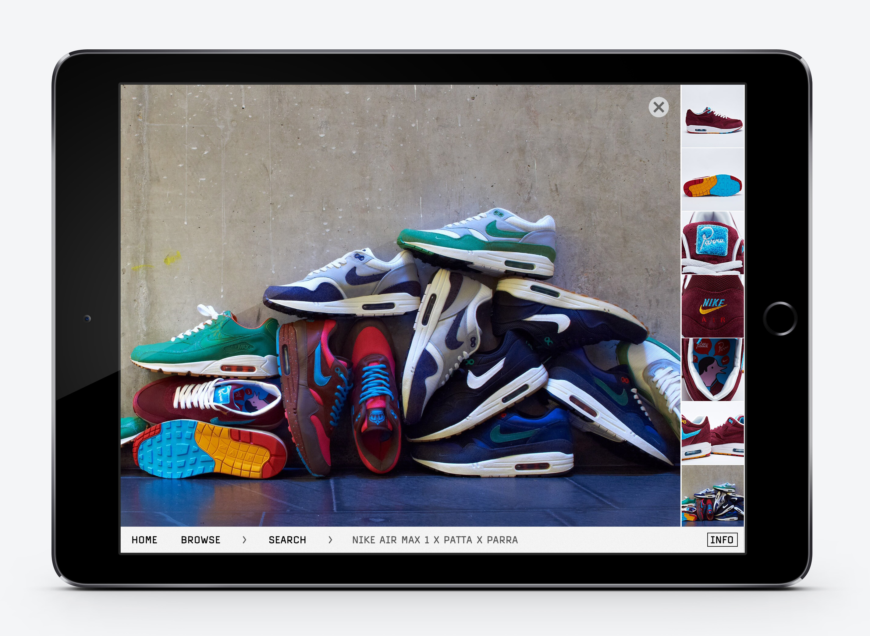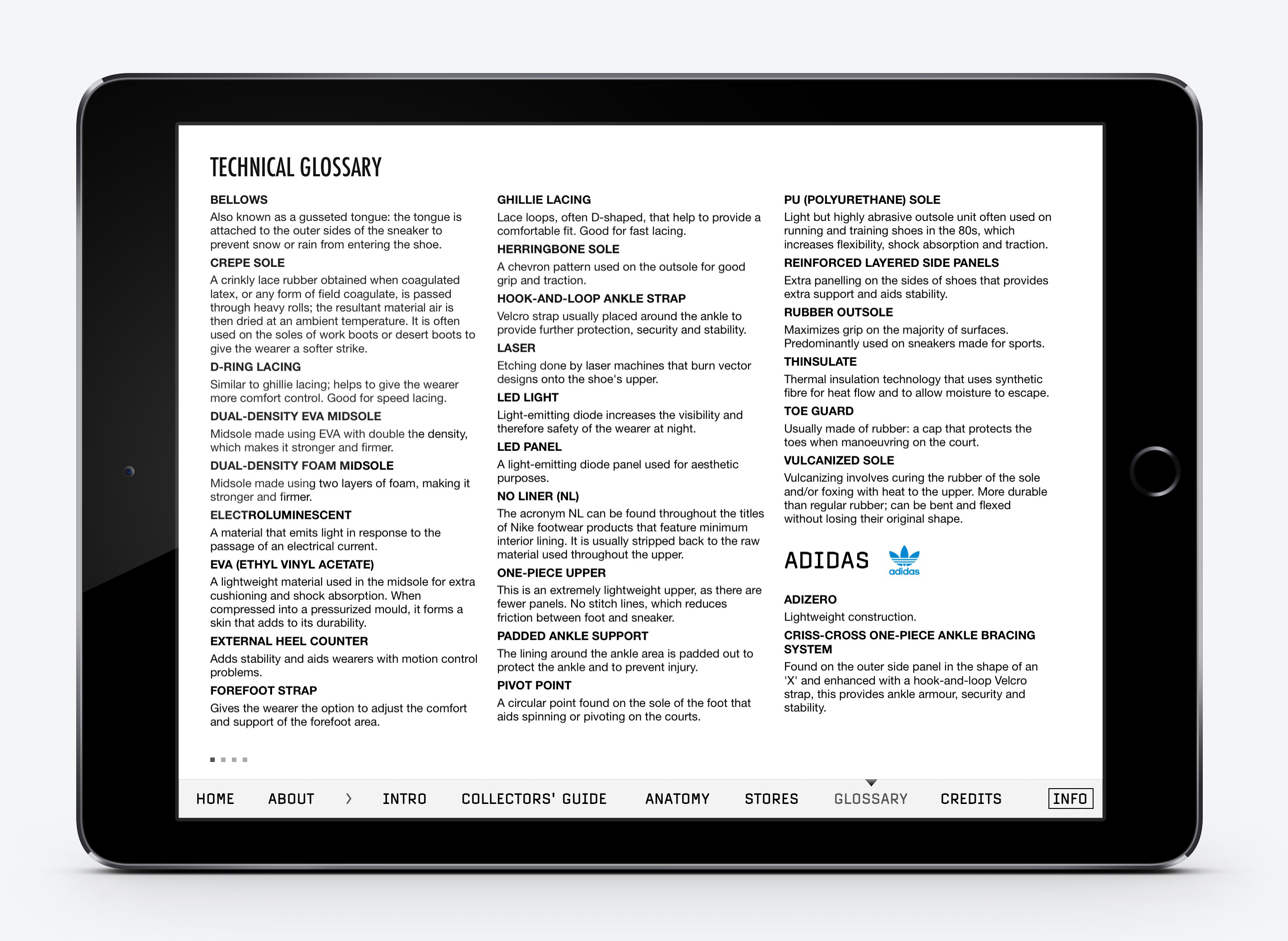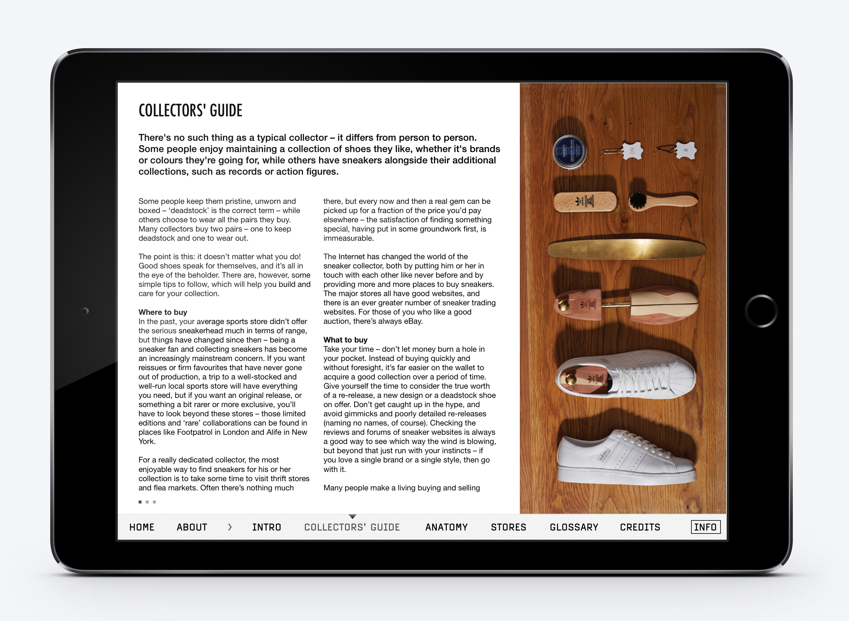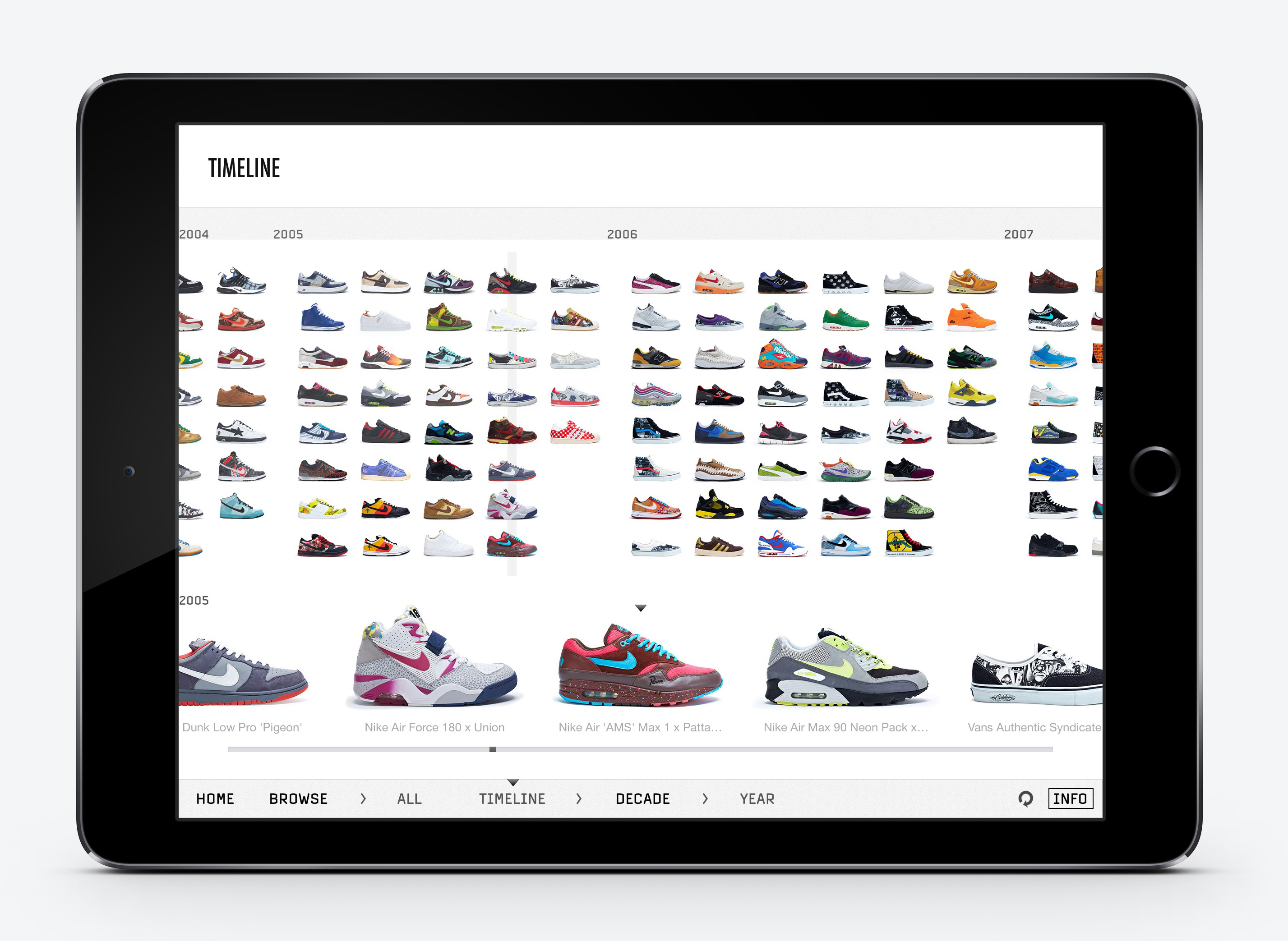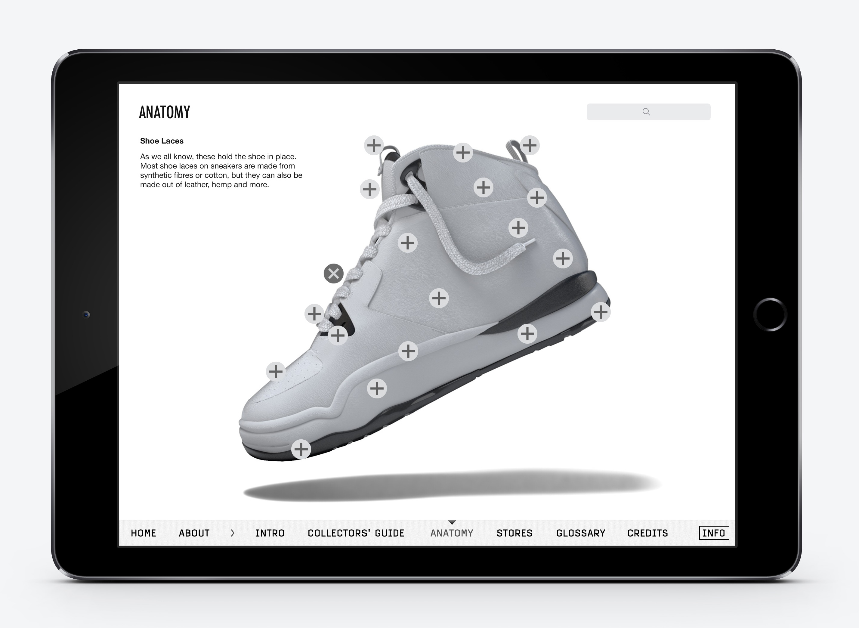 The iPad app contains over 500 sneakers. All photographed with 360 degree rotations and detail shots, accompanied by expert information and facts.
