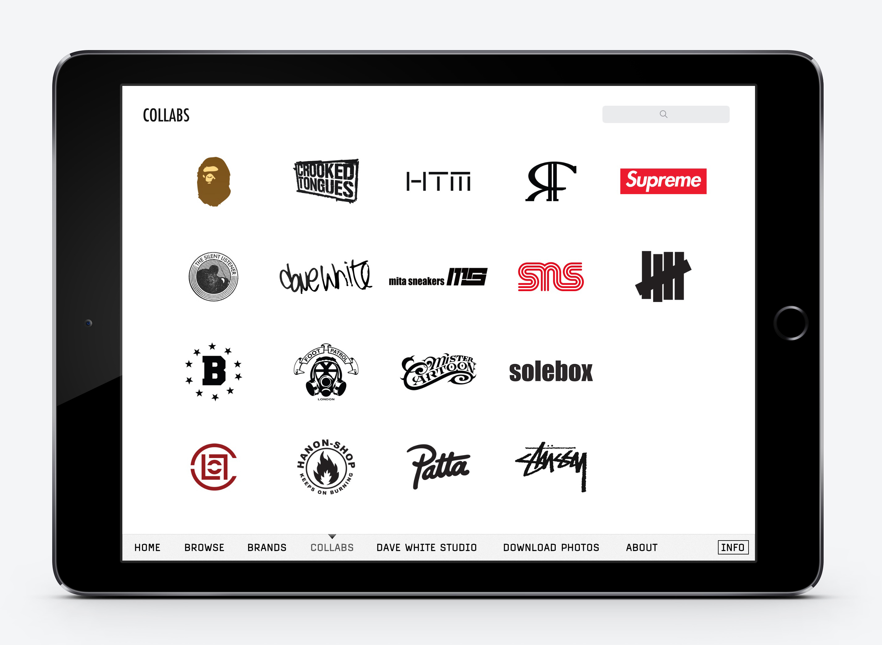 This app features many of the sneaker 'Holy Grails' for collectors. Collaborations from, among others, adidas, A Bathing Ape, Air Jordan, Asics, Converse, Ewing, Fila, Lacoste, Le Coq Sportif, New Balance, Nike, Onitsuka Tiger, Pony, Pro-Keds, Puma, Reebok, Saucony, Vans.Featured collaborators: Atmos, Bape, Ben Drury, Bodega, CLOT, Colette, Crooked Tongues, Dave White, DQM, Footpatrol, Futura, Hanon, Kenzo, Hello Kitty, HTM, House 33, Huf, Hypebeast, Jeremy Scott, Kanye West, Kaws, Kidrobot, LA MJC, Marvel, Mita Sneakers, Missoni, Mister Cartoon, Neighborhood, Noel Gallagher, Offspring, Patta, Pharrell Williams, Ronnie Fieg, Run DMC, Size?, Slam Jam, Sneakersnstuff, Solebox, Star Wars, Stash, Stssy, Supreme, Undefeated, Wood Wood, Yo! MTV Raps.